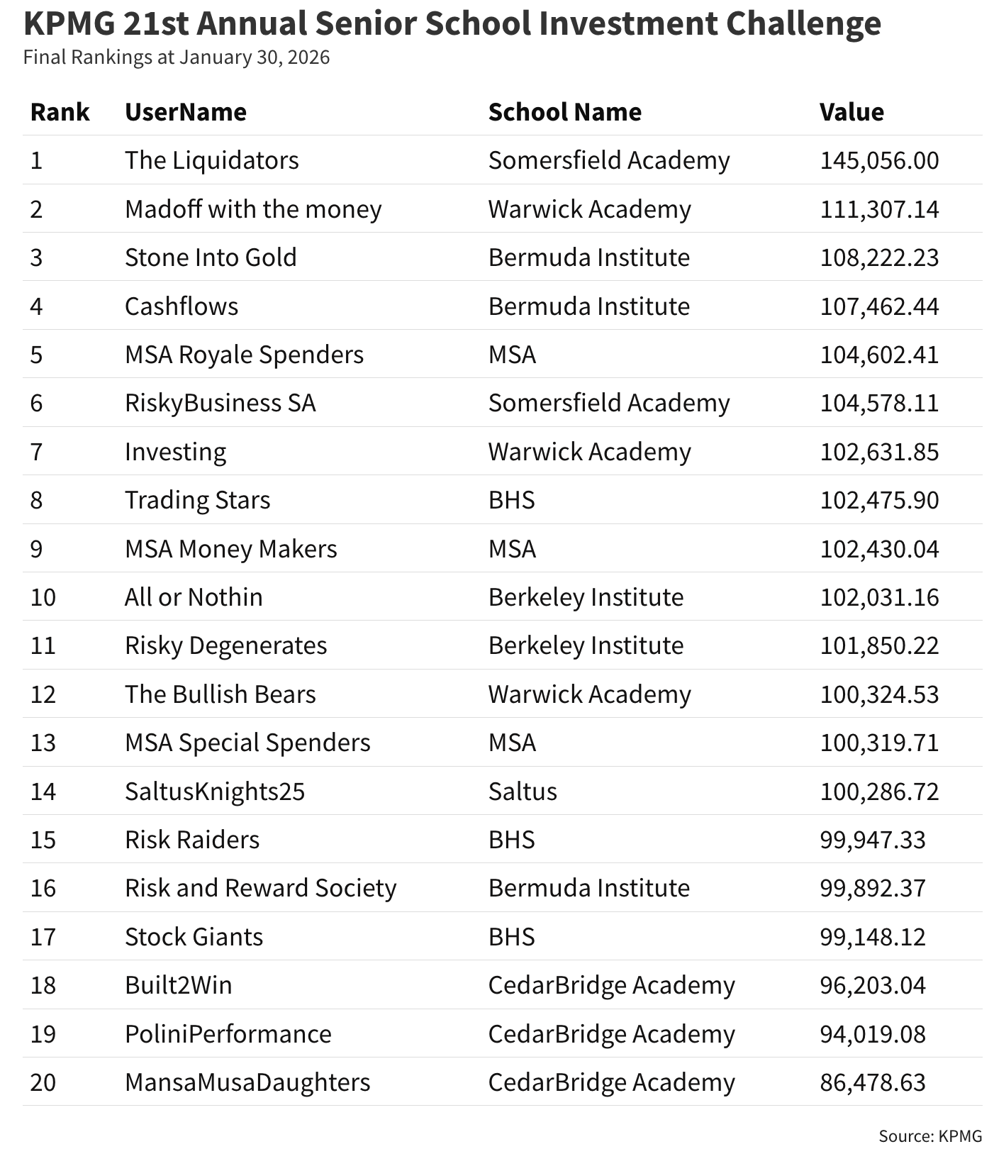 February 3, 2026 — Somersfield Academy students are once again among the top performers in the KPMG Senior School Investment Challenge, building on a strong record in the long-running competition.